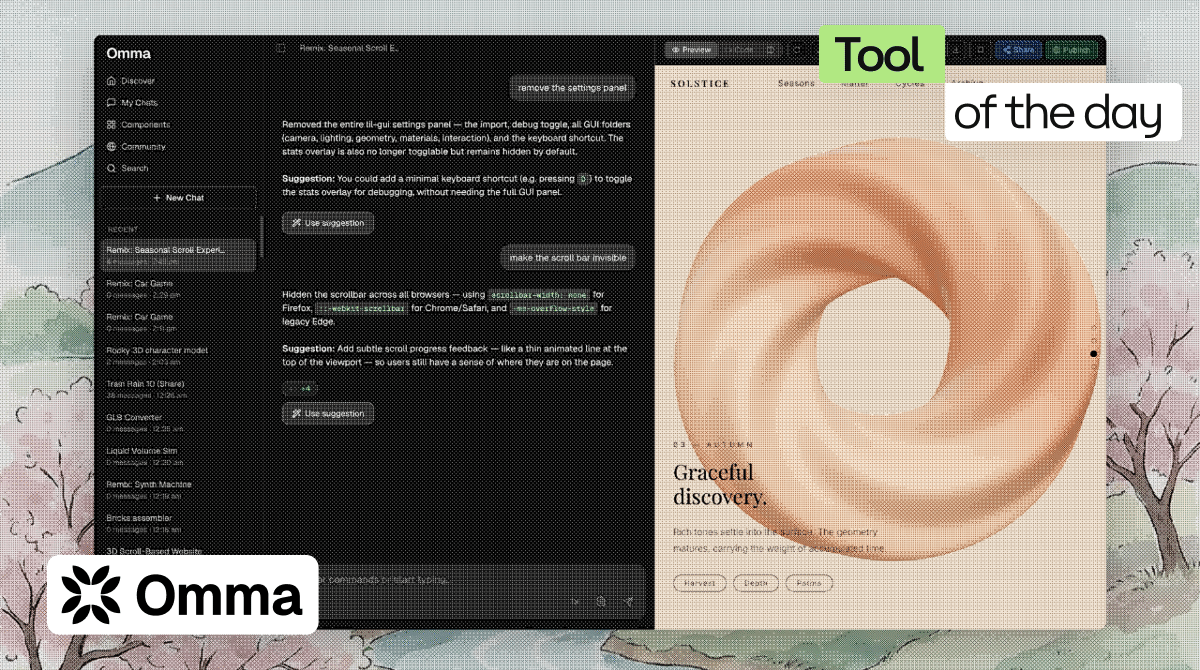 Omma lets you generate fully interactive 3D websites and apps from a text prompt. Type a description, get a working 3D landing page in minutes and edit it with follow-up prompts.