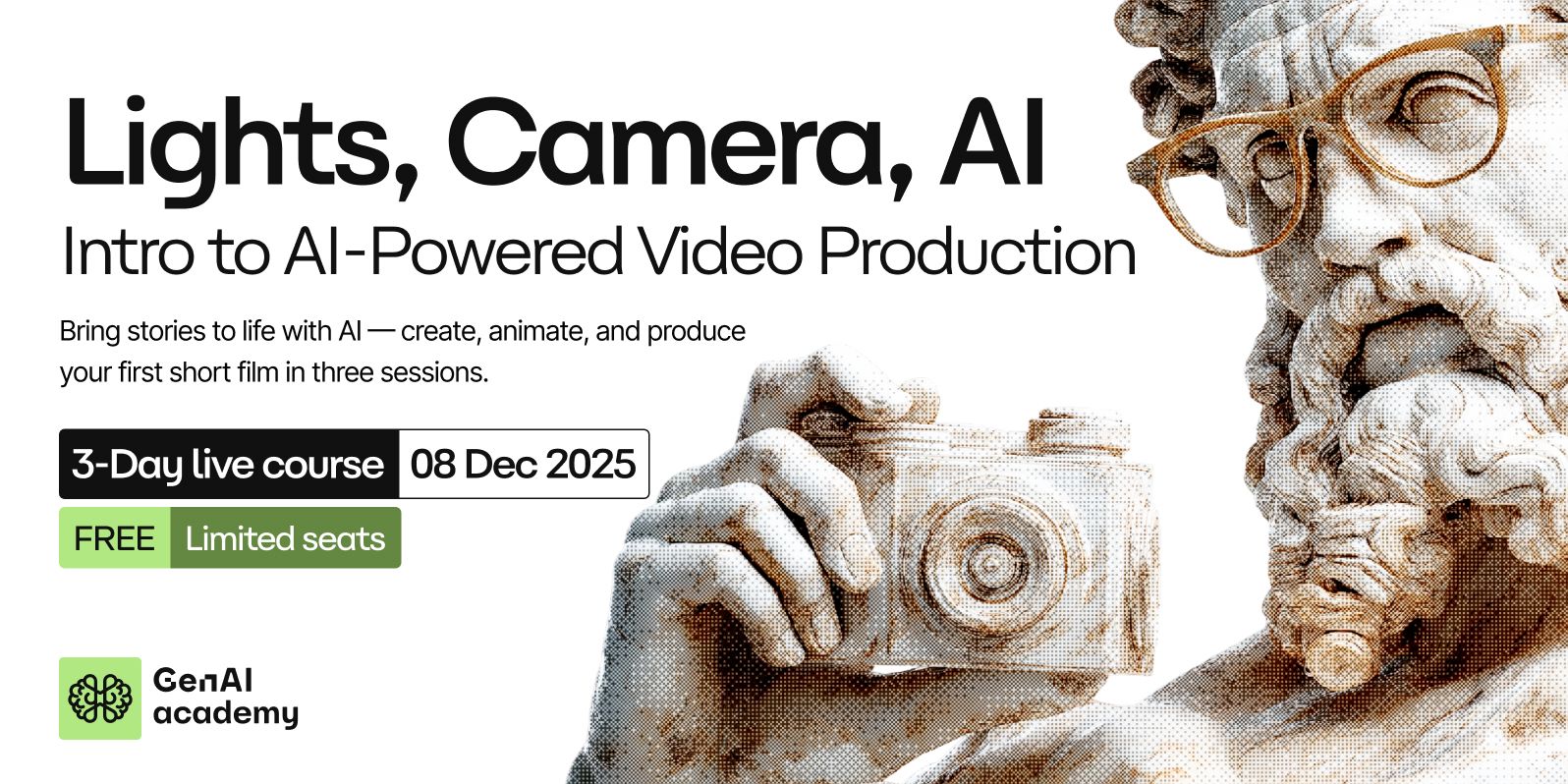 Lights, Camera, AI - Intro to AI Powered Video Production is a live course where you’ll create short films using modern AI workflows, learning alongside a community of 13M+ learners.