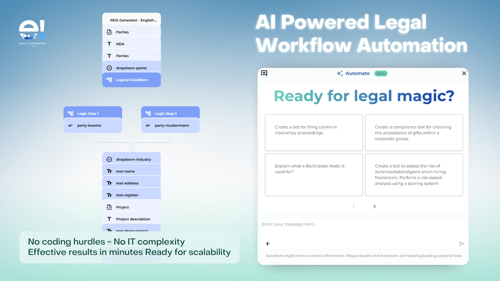 With e! by lexemo’s AutoMate, you simply describe your legal reasoning in plain language. The system turns it into a structured, visual workflow you can review and refine step by step.