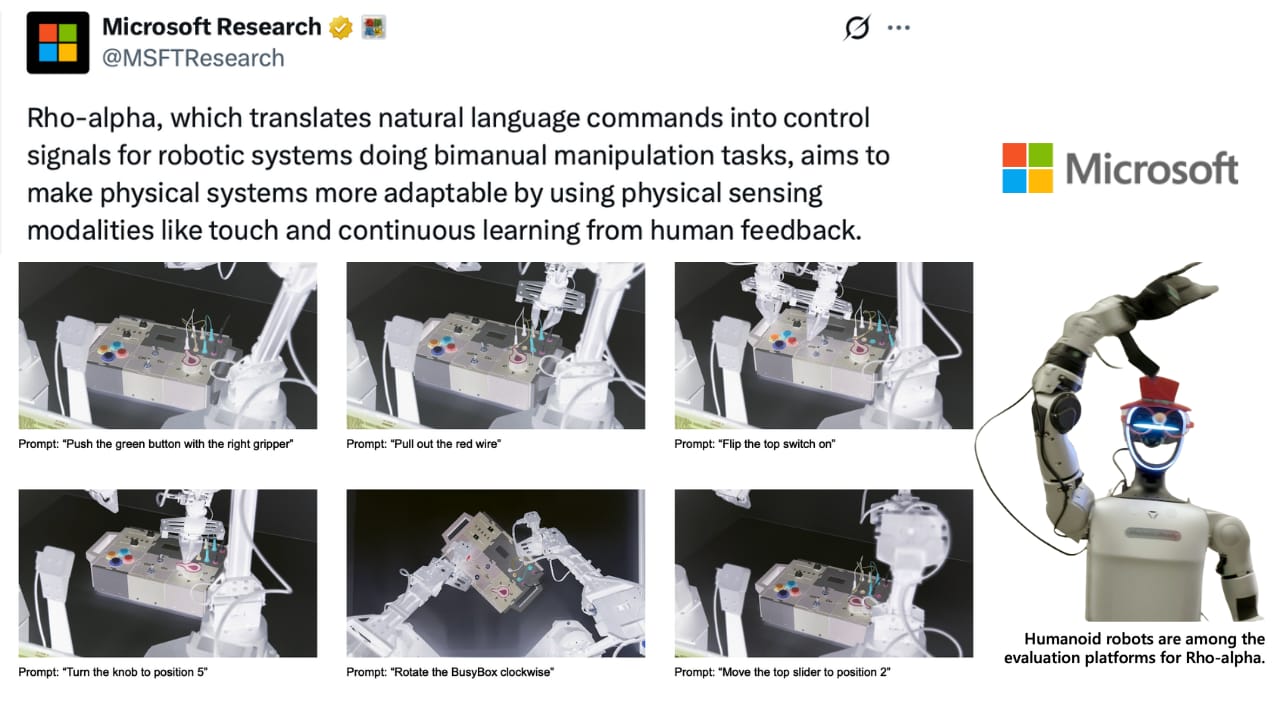 Microsoft debuts Rho-alpha for touch-sensitive robotic tasks.