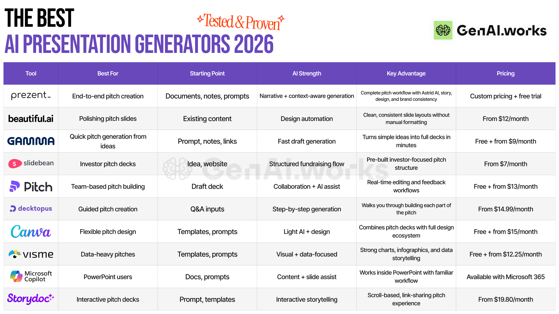 Most AI tools are just design shortcuts. Some focus on layout automation; others help with fast drafting or rigid step-by-step guides. While they save time on visuals, you’re still left doing the heavy lifting of shaping the narrative and fixing brand inconsistencies.